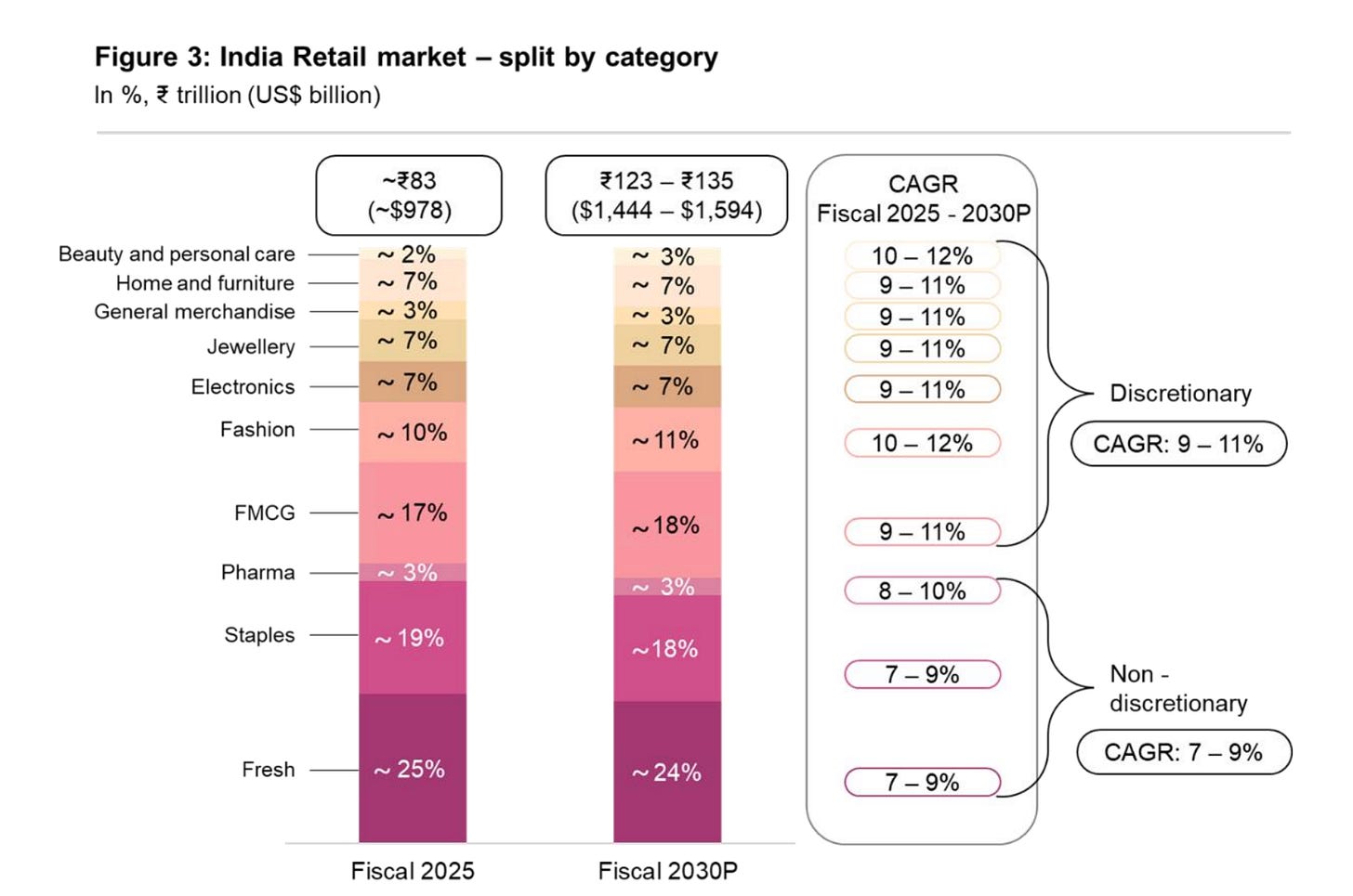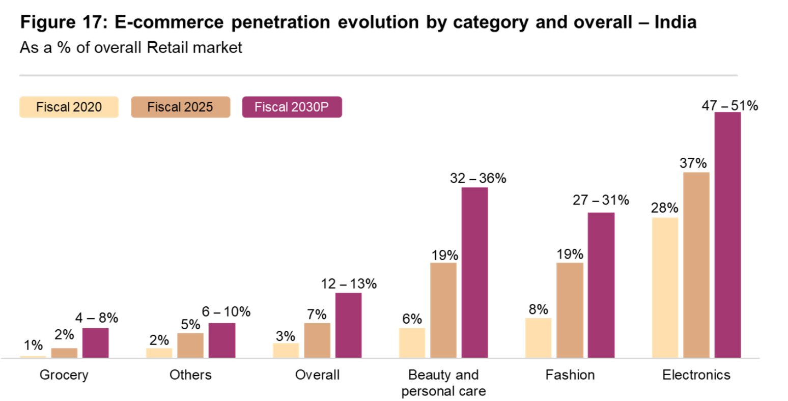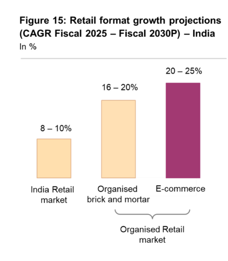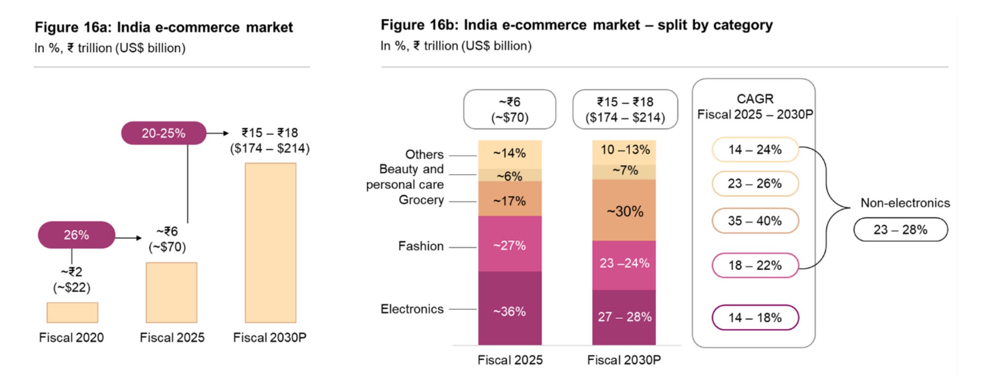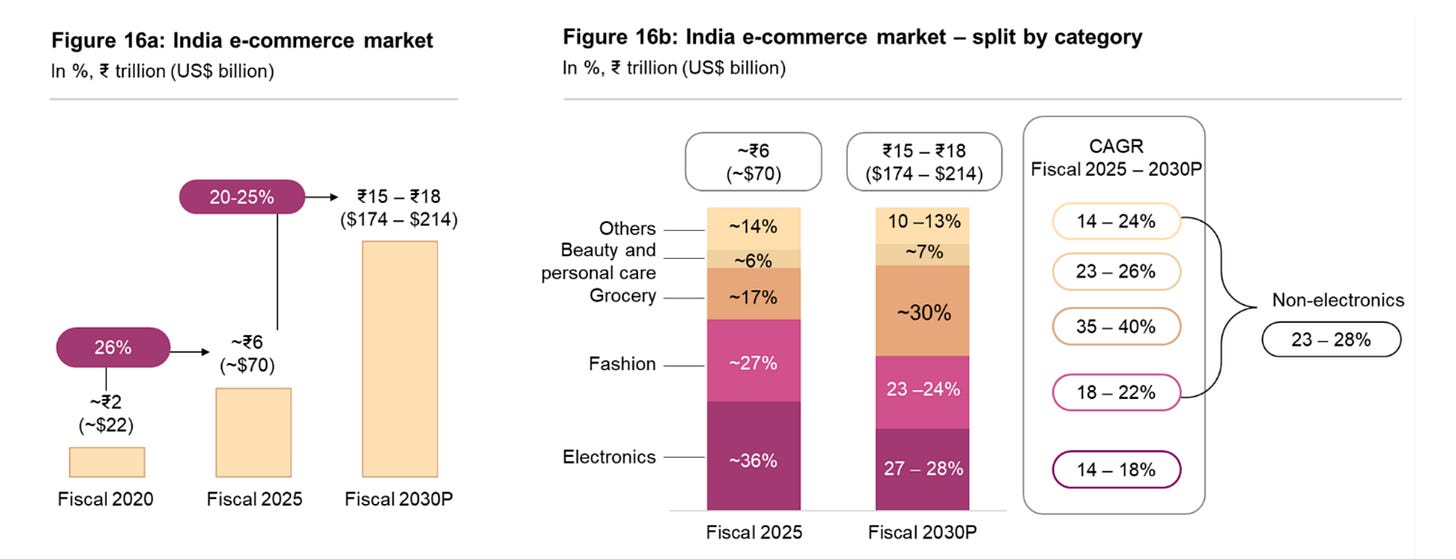 India’s e-commerce market (including quick commerce) is projected to grow at 20–25% CAGR over the next 5 years, riding on the high growth potential in the non-electronics categories